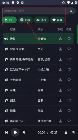 1、进入音乐界面,可【搜索歌曲、歌手,选择热门、新歌】等分类,享受音乐播放与选择服务。