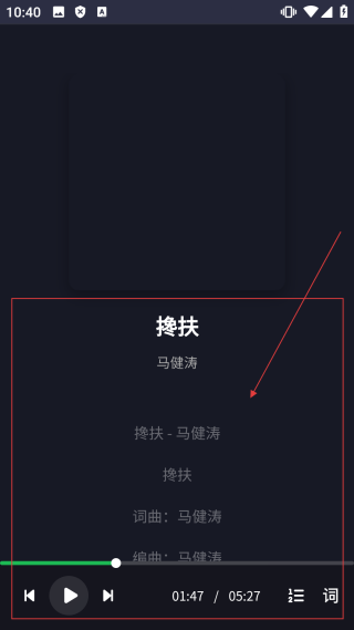 4、进入歌曲播放界面,可【查看歌曲信息,控制播放进度,切换歌曲】,享受音乐播放的便捷操作。