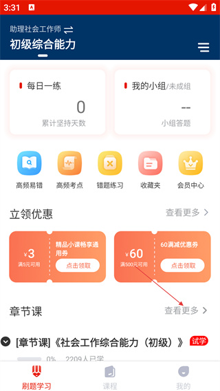 2、在刷题学习页面中,点击章节课程旁边的【更多】选项,进入课程列表页面。