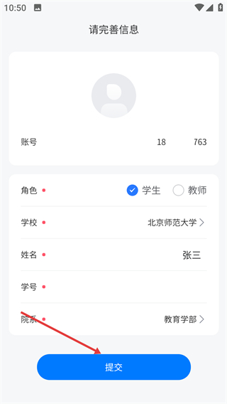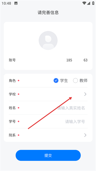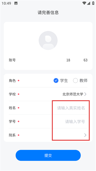 3、返回信息完善页面,输入【姓名】【学号】并选择【院系】。