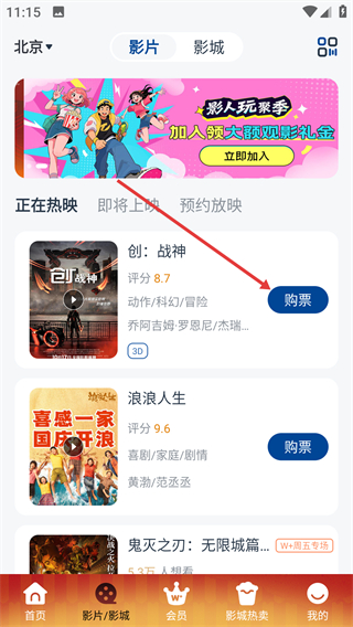 3、选择目标影片,如《创:战神》,点击【购票】按钮。