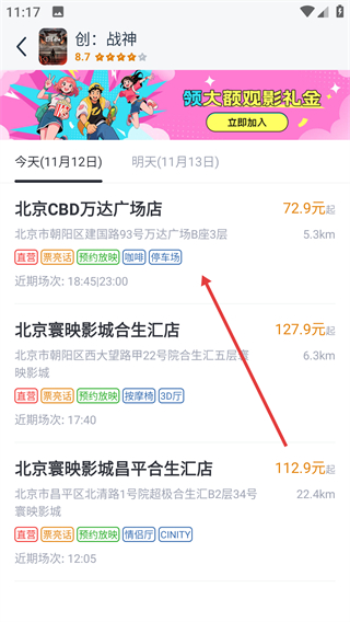 4、进入影片详情页,选择影院,如【北京CBD万达广场店】,完成购票前的影院选择操作。