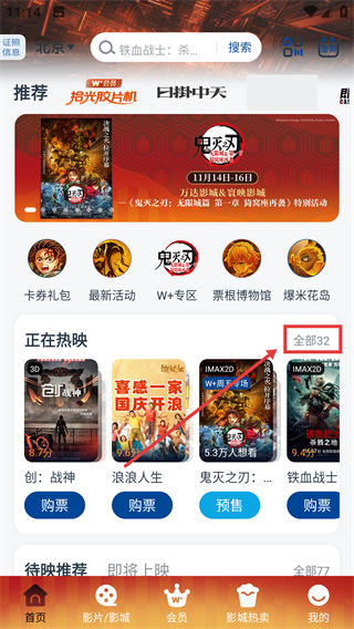 2、在影讯页面点击【正在热映】的【全部32】选项,查看所有热映影片。