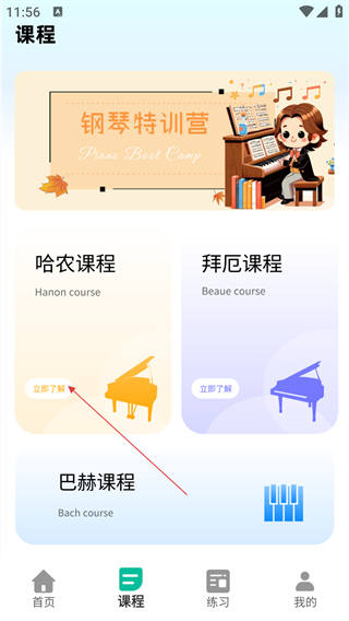 3、在课程页面,选择【哈农课程】并点击【立即了解】,进入课程详情页。