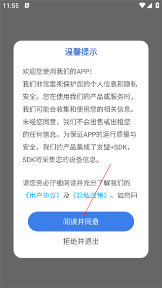 1、在APP温馨提示弹窗中点击【阅读并同意】按钮,进入首页。