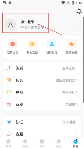 1、在APP的“我的”页面,点击【点击登录】区域,可进入登录选择界面,以便进行账号登录或注册。