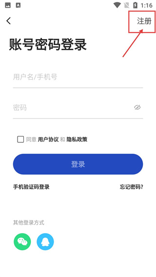 3、在账号密码登录页面,若没有账号,点击右上角【注册】按钮,可进入注册新账号页面进行账号注册。