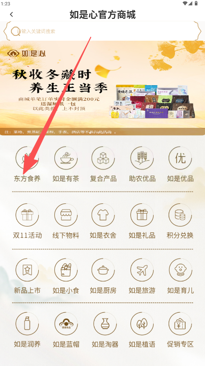 2、在商城页面选择“东方食养”分类浏览养生商品。