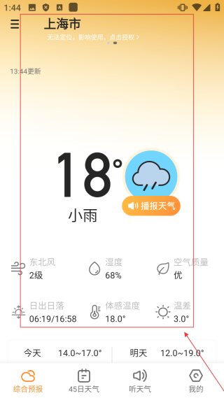 2、直观呈现24小时气温起伏变化,清晰标注早晚温差区间,让用户提前做好保暖或降温准备,避免温差带来的身体不适。