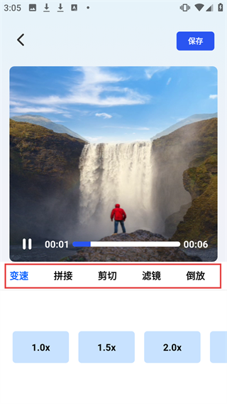 4、在变速编辑界面,可选择【1.0x】【1.5x】【2.0x】等速度进行调整,完成后点击【保存】即可。