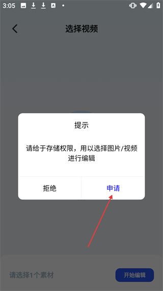 2、在存储权限提示框中点击【申请】,获取存储权限以选择视频素材。