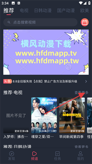 1、进入横风动漫首页,对于电视类内容,点击【查看更多】可浏览更多电视视频。