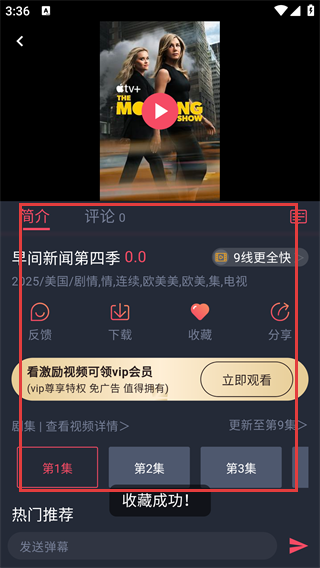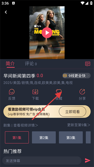 3、点击进入电视详情页,可查看其评分、简介等信息,点击【收藏】可将该电视内容保存至收藏夹,方便后续查看。