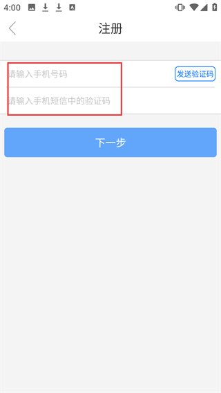 4、在注册界面输入手机号码,点击【发送验证码】并填写短信验证码,点击【下一步】完成注册。