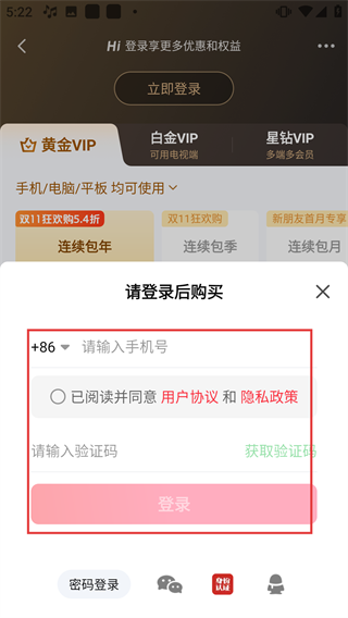 4、在登录界面输入手机号,勾选协议后获取并填写验证码,点击【登录】后完成VIP购买。