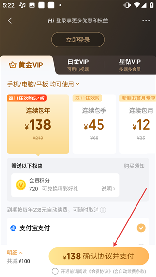 3、在VIP会员购买界面点击【确认协议并支付】,进入登录界面。