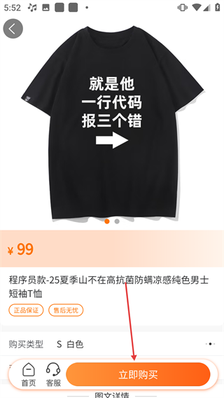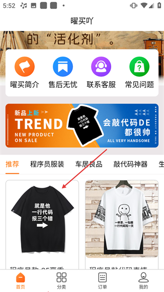 1、在“曜买吖”首页点击目标程序员T恤商品,进入商品详情页。