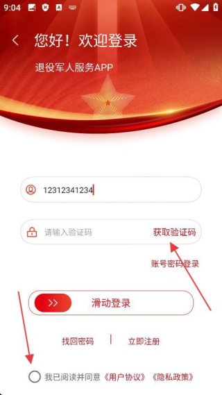 3、在验证码登录界面,勾选【协议】后点击【获取验证码】,获取并填写验证码。