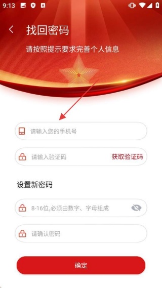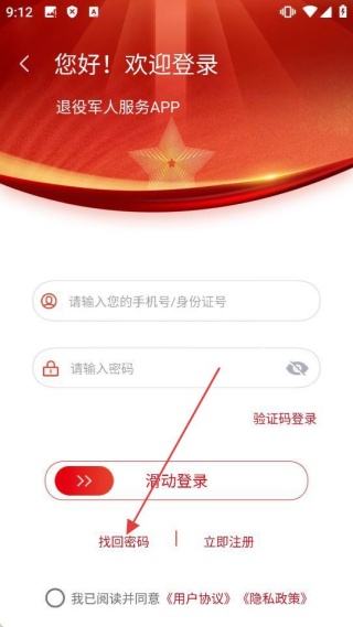 1、在退役军人服务登录界面,点击【找回密码】,进入找回密码界面。