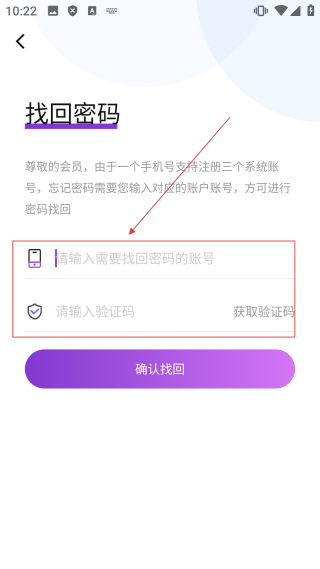 3、在找回密码界面,输入【需要找回密码的账号并获取验证码】,填写验证码。