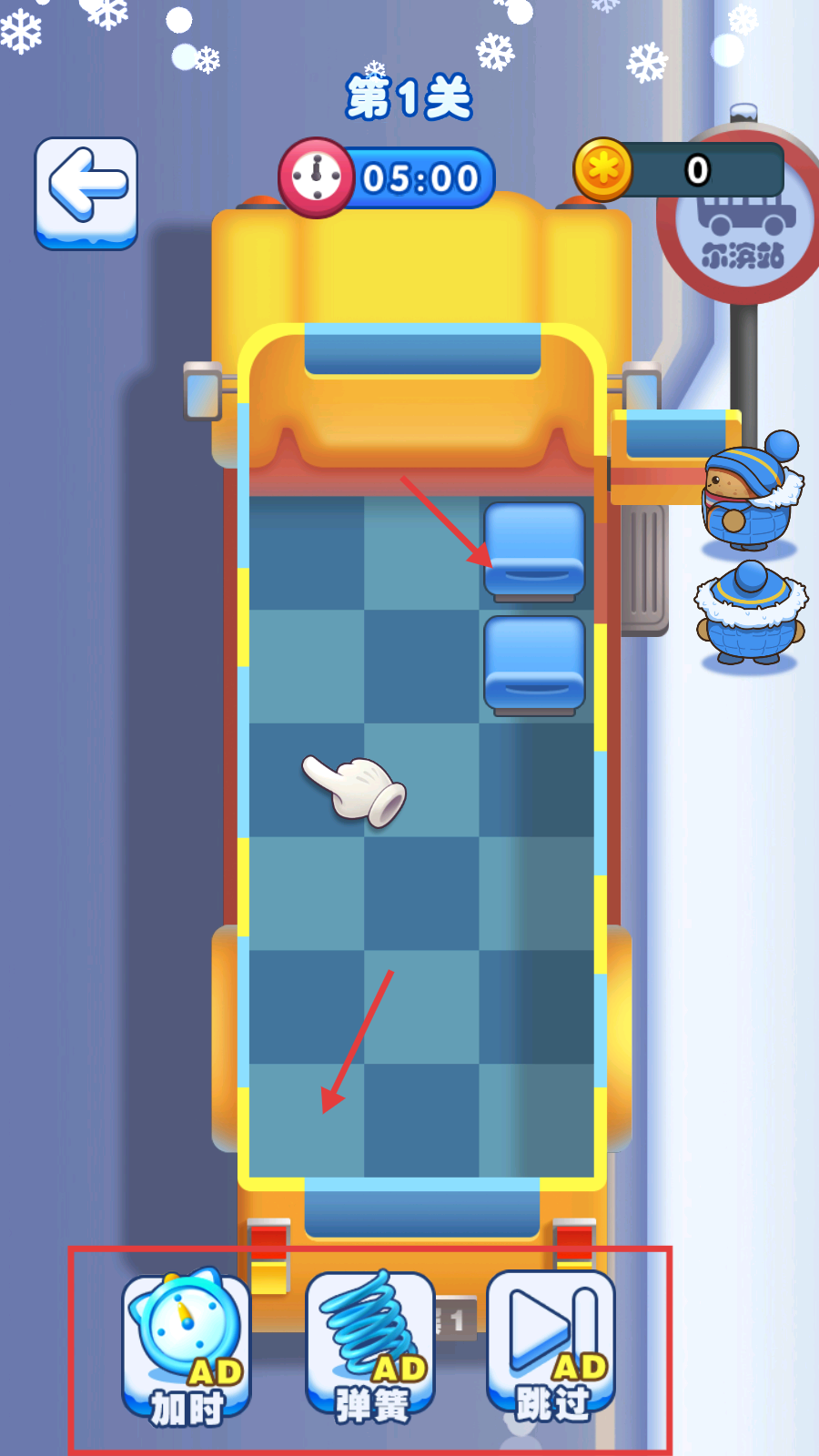 3、在第1关游戏中,根据提示进行操作,可使用下方【加时】【弹簧】【跳过】等功能,完成关卡任务。