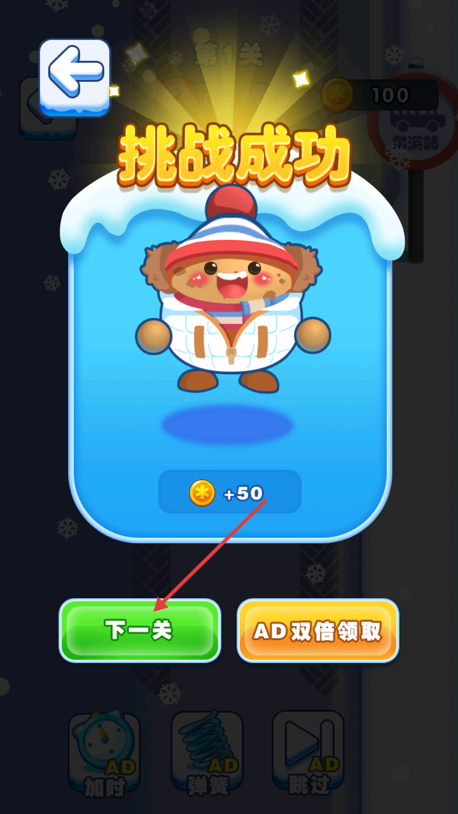 4、成功完成第1关后,界面显示“挑战成功”,可点击【下一关】继续挑战,同时获得金币奖励。