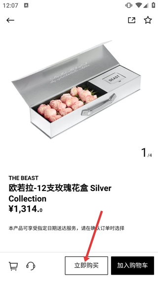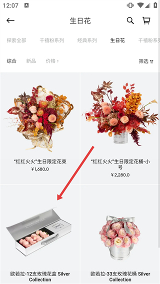 3、在生日花列表中选择目标花品,如【欧若拉-12支玫瑰花盒SilverCollection】,进入商品详情页面。