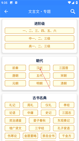 2、在文言文专题页面,选择【汉代】朝代,进入汉代文言文列表页面。