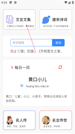 1、在软件首页,点击【文言文集】选项,进入文言文专题页面。