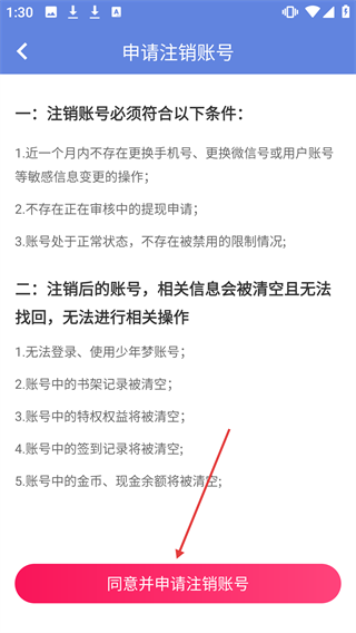 3、在申请注销账号页面,确认注销条件和后果后,点击【同意并申请注销账号】。
