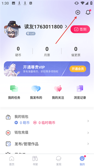 2、在我的页面,点击右上角设置图标,进入设置界面。