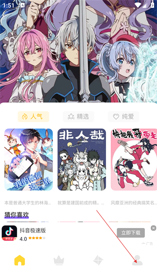 1、在软件首页可浏览人气漫画,若需个人功能可点击底部个人中心按钮进入个人中心界面。
