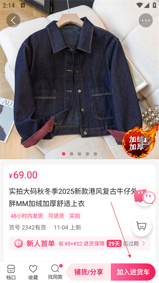 4、在商品详情页面,点击【加入进货车】按钮,可将该商品加入进货车。