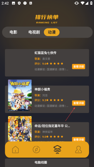 3、在动漫排行界面,点击【想要查看的动漫旁的查看详细】,进入动漫详情界面。
