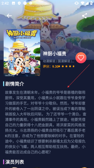 4、在动漫详情界面,即可【查看该动漫的剧情简介、演员列表】等信息。