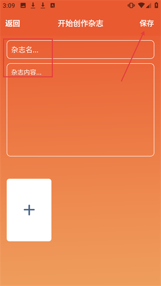 4、在开始创作杂志页面,填写【杂志名...】【杂志内容...】,点击右上角【保存】即可完成创作。
