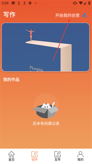 3、在写作页面,点击右上角【开始我的创意】,可进入创作杂志的环节。
