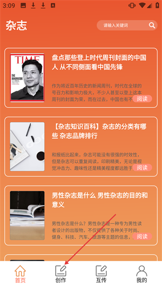 2、在杂志应用首页,点击底部【创作】按钮,可进入创作页面。