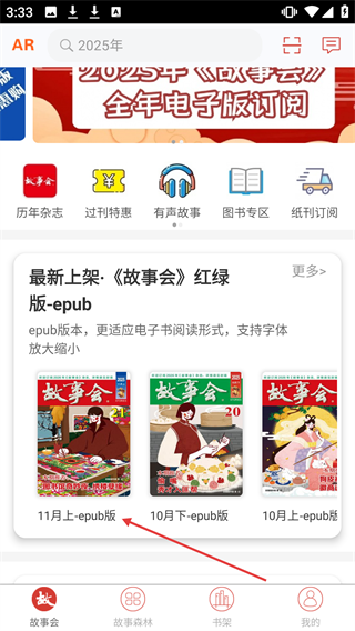 1、在应用首页找到【最新上架・《故事会》红绿版-epub】区域,点击【11月上-epub版】进入详情页。