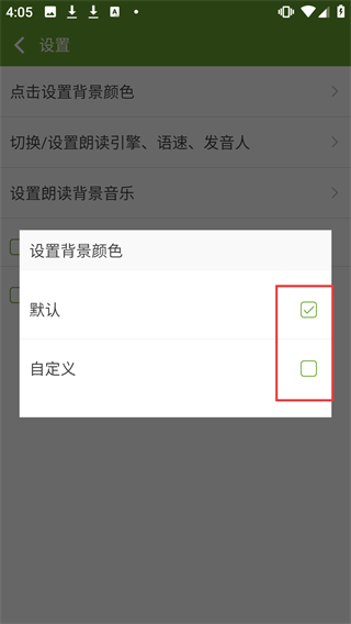 4、在弹出的设置背景颜色弹窗中,可选择【默认】或【自定义】背景颜色。
