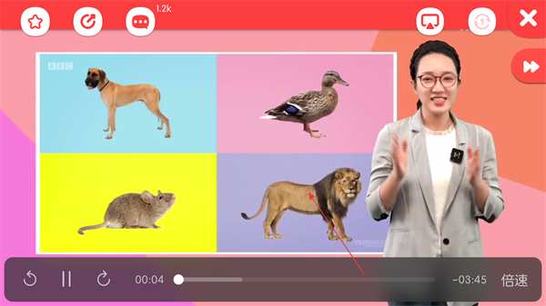 4、进入【动画讲解】后,可观看包含动物图像与讲师讲解的视频,按视频进度学习听力口语知识。