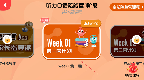 2、进入【听力口语陪跑营-1阶段】后,选择【Week-01第一周计划】可开始第一周的课程学习。