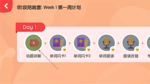3、在【Week-1第一周计划】的【Day-1】中,点击【动画讲解】可开启当天的学习内容。