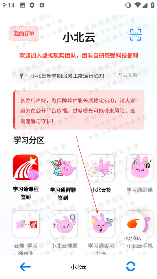 1、在小北云界面,点击【学习通实习打卡】,进入实习打卡登录界面。