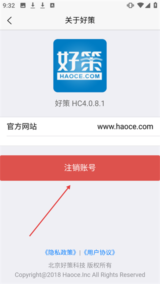 3、进入【关于好策】页面后,点击【注销账号】按钮。