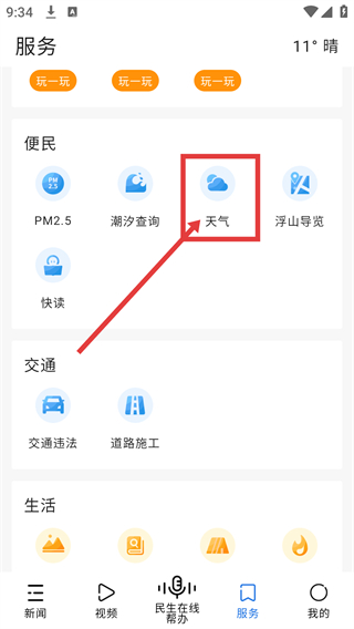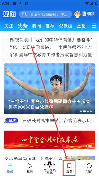 1、在观海新闻首页,点击底部【服务】,可进入服务页面,准备查询天气信息啦。