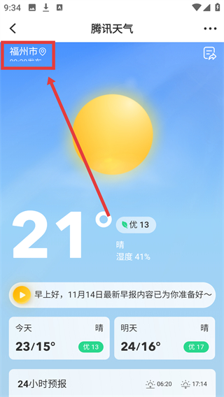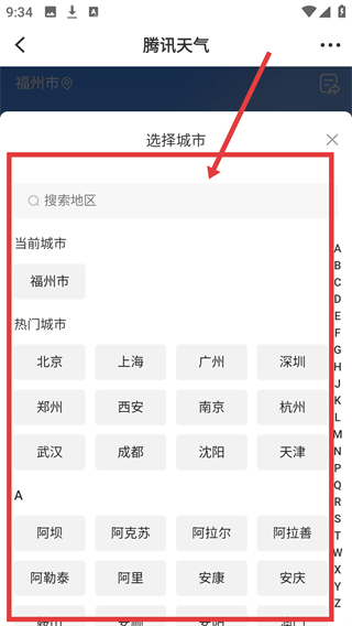 3、在腾讯天气页面,点击左上角城市名称,可进入城市选择页面啦。