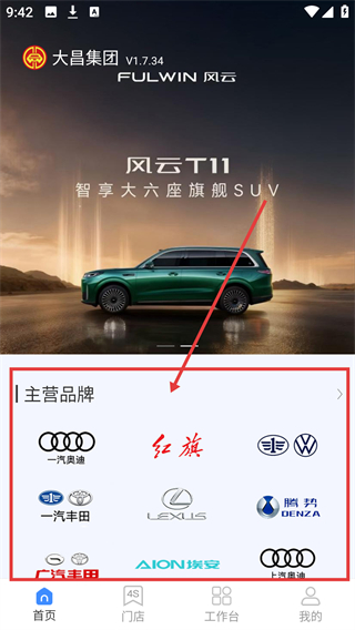 1、在首页点击【主营品牌】,进入品牌列表界面,可查看各品牌门店哦。