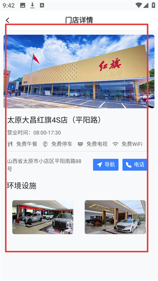 3、在门店列表点击门店,进入门店详情界面,可查看门店营业时间、地址等信息哦。
