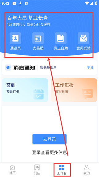 4、点击【工作台】,进入工作台界面,可使用通讯录、大昌报等功能,开启办公之旅啦。